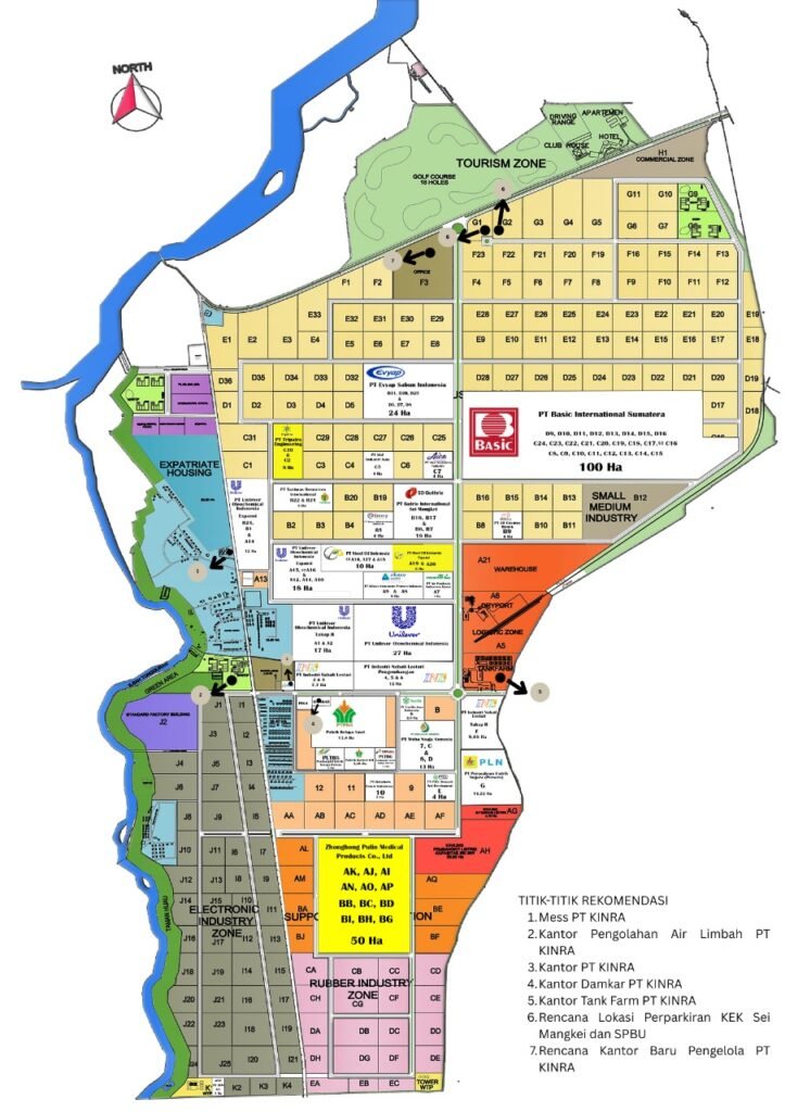 Berdasarkan gambar denah yang ditampilkan, rencana penyebaran proyek tower telekomunikasi dan data center disusun secara strategis di dalam kawasan industri dan penunjangnya dengan mempertimbangkan fungsi zona, kebutuhan konektivitas, serta efisiensi infrastruktur. Denah tersebut menggambarkan kawasan terintegrasi yang terdiri atas zona industri, logistik, perumahan, komersial, hingga fasilitas utilitas, sehingga penempatan tower dan data center dirancang untuk menjangkau seluruh area secara optimal.